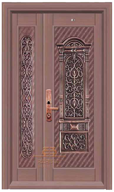 产品加工:1.钢质材料经过抗氧化处理后,剪板折弯,焊接成型,2.紫铜板经过氧化拉丝封釉,剪板折弯,依照钢        内胆大小做处各分件后,粘贴于内胆表面,手工工制作成分较多,故此铜门对手工要求是比较高的