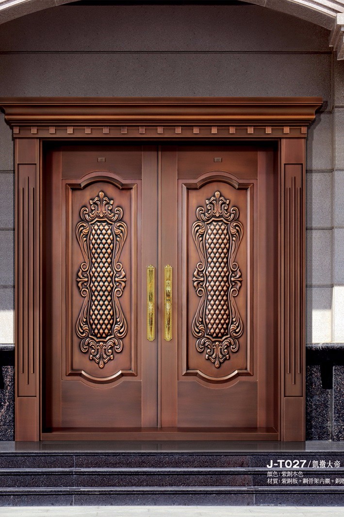 产品加工:1.钢质材料经过抗氧化处理后,剪板折弯,焊接成型,2.紫铜板经过氧化拉丝封釉,剪板折弯,依照钢        内胆大小做处各分件后,粘贴于内胆表面,手工工制作成分较多,故此铜门对手工要求是比较高的