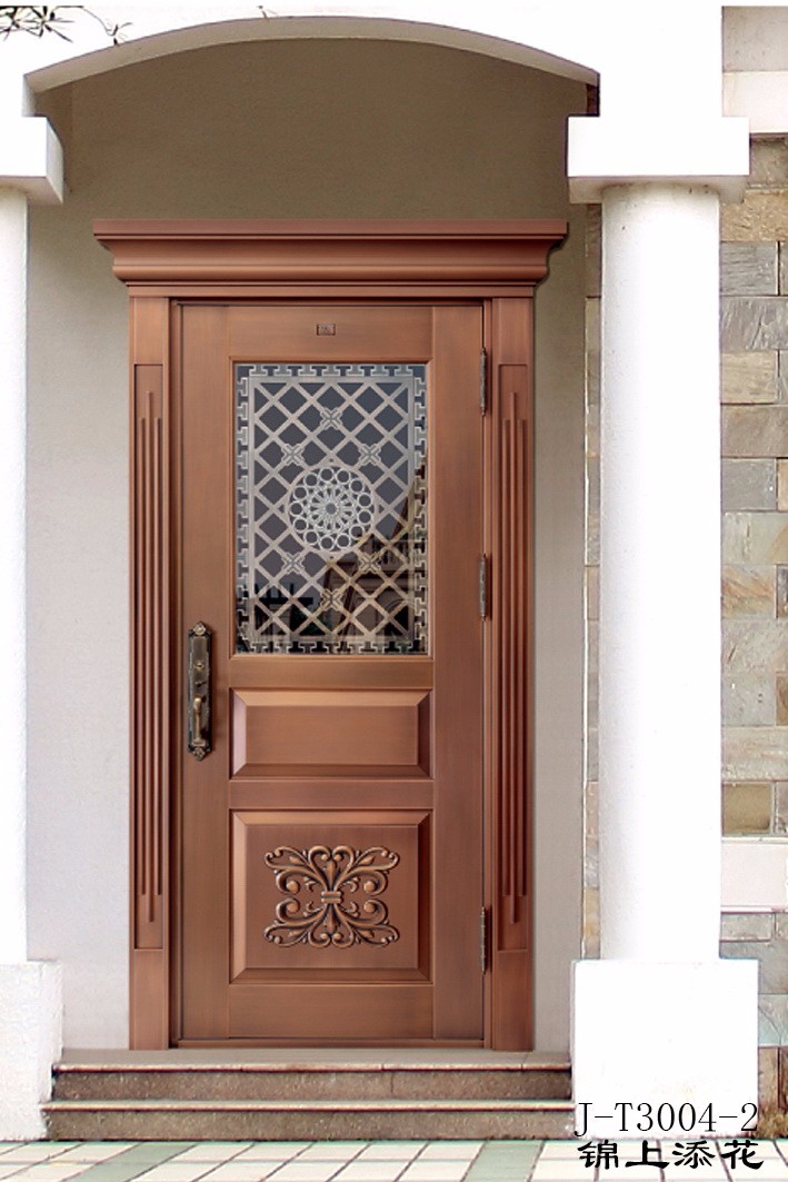 产品加工:1.钢质材料经过抗氧化处理后,剪板折弯,焊接成型,2.紫铜板经过氧化拉丝封釉,剪板折弯,依照钢 内胆大小做处各分件后,粘贴于内胆表面,手工工制作成分较多,故此铜门对手工要求是比较高的