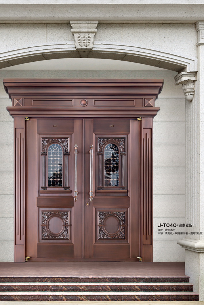 产品加工:1.钢质材料经过抗氧化处理后,剪板折弯,焊接成型,2.紫铜板经过氧化拉丝封釉,剪板折弯,依照钢 内胆大小做处各分件后,粘贴于内胆表面,手工工制作成分较多,故此铜门对手工要求是比较高的