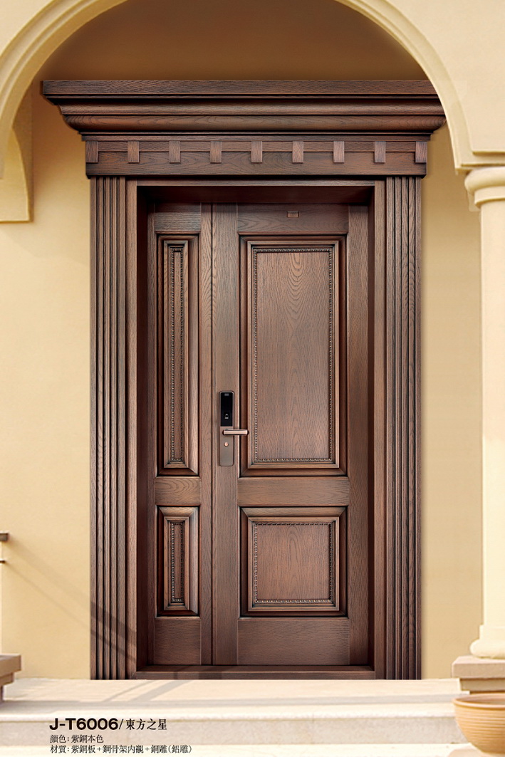 左右臣铜门重量重,里面有内衬,一个门做两层,表层是铜皮,里层做镀锌板或者不锈钢内衬。